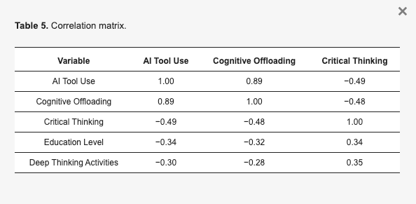 Gerlich, M., January 2025. AI Tools in Society: Impacts on Cognitive Offloading and the Future of Critical Thinking (link)