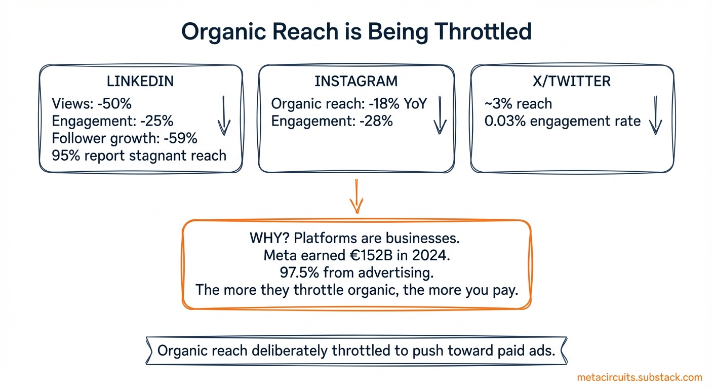 For LinkedIn, 95% of LinkedIn users now report stagnant or declining reach, with views down 50%, engagement down 25%, and follower growth down 59%.