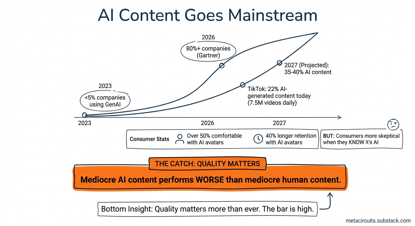On TikTok, 22% of all content is already AI-generated. 7.5 million AI videos are uploaded daily. By December 2027, projections suggest 35-40% of content on the platform will be substantially AI-generated.