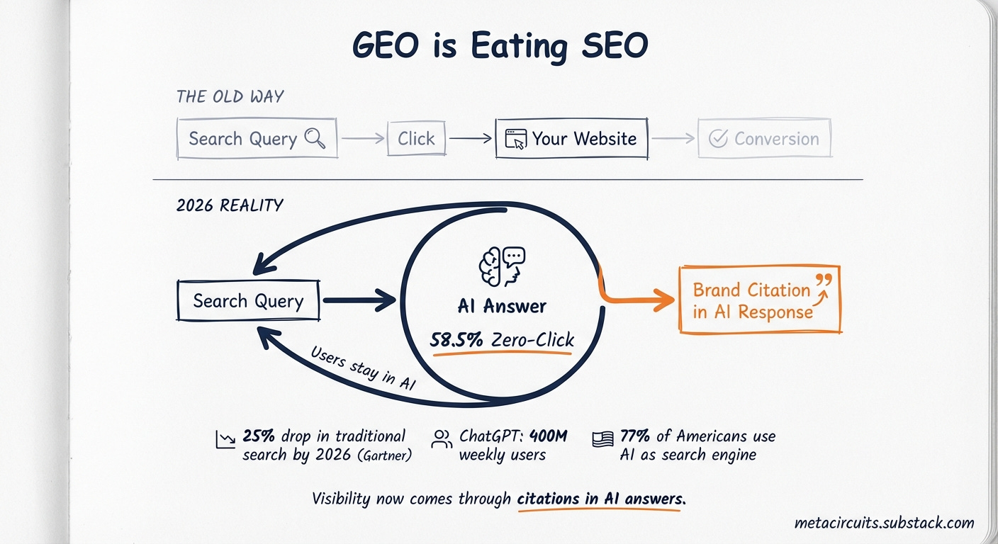 Gartner predicts a 25% drop in traditional search volume for 2026, with organic search traffic expected to decrease by over 50%. Nearly 58.5% of Google searches now end without a single click, and AI overviews already appear in almost 47% of all searches.