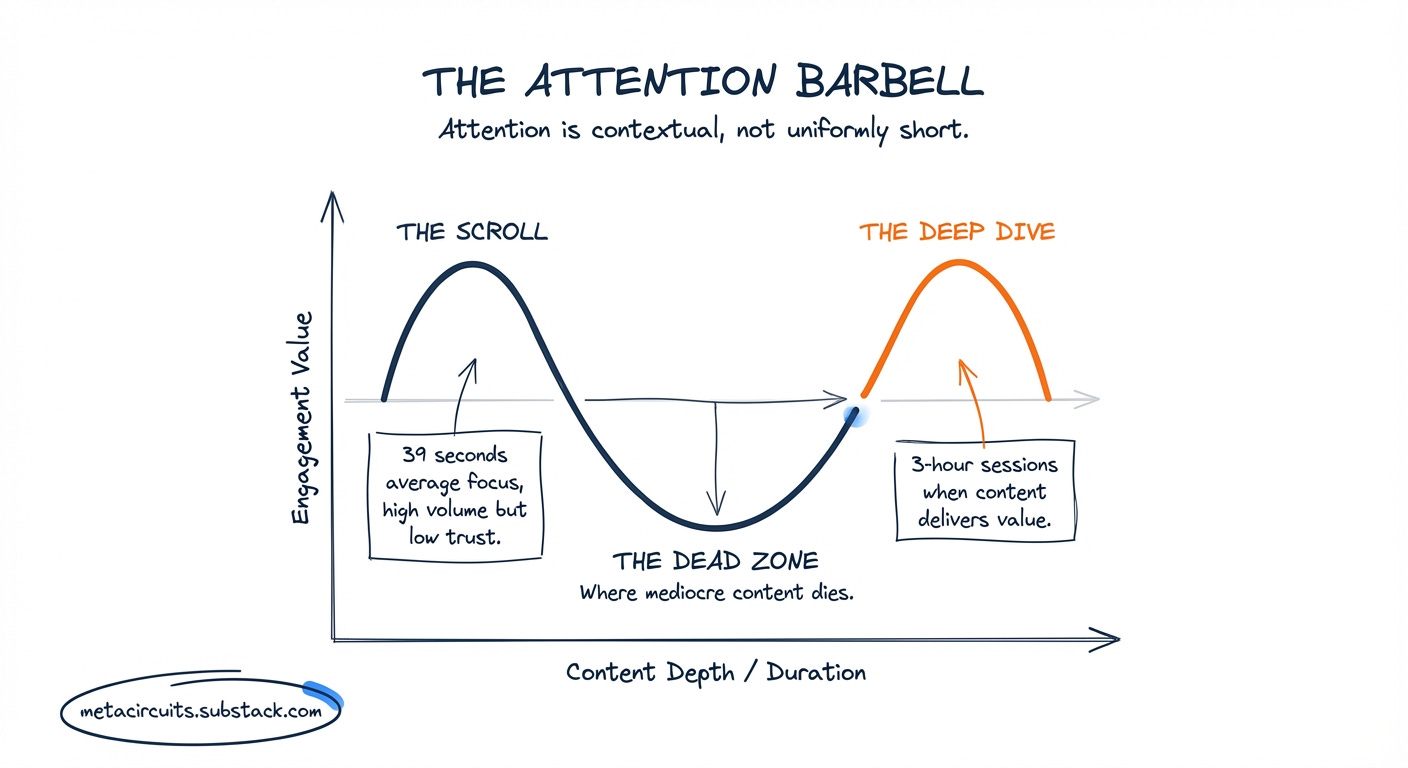 Hook in 3 seconds, deliver in 3 minutes. Attention spans are contextual.