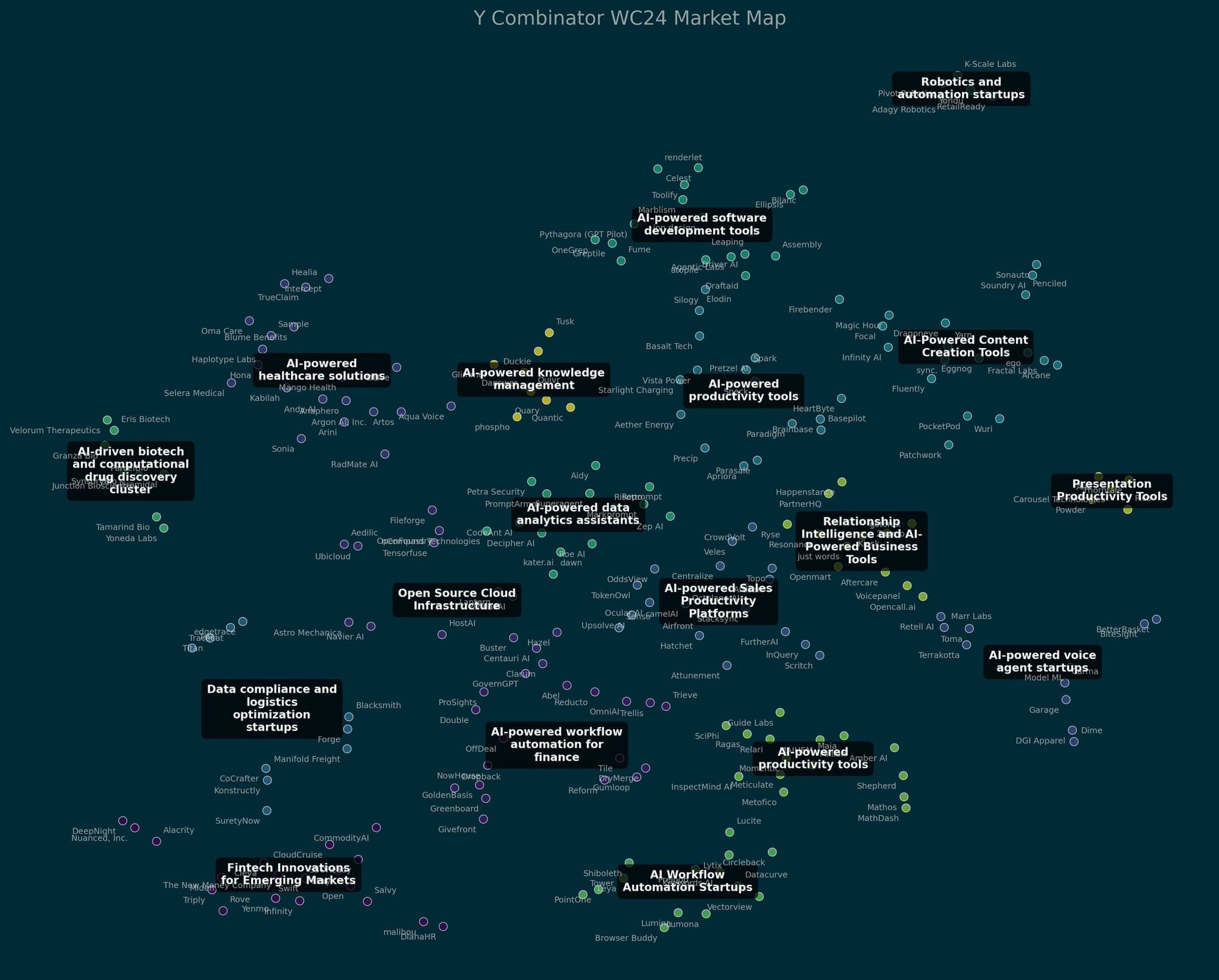 The chart below shows the focus areas of the Winter 2024 batch of Y Combinator startups, in a cluster analysis by Deedy Das.