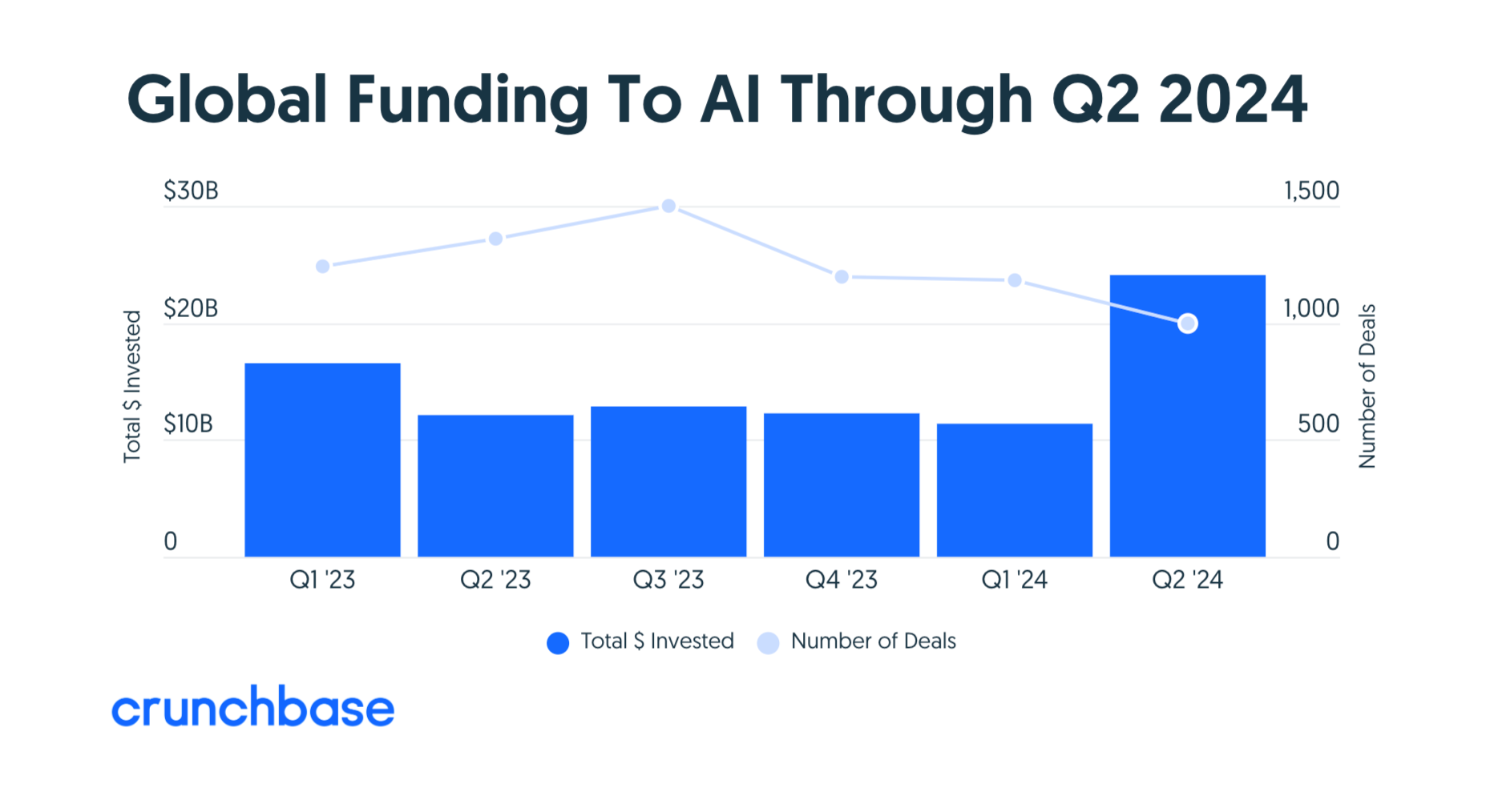 Then there is the amount of venture capital backing AI startups. According to Crunchbase data, in Q2 of 2024 roughly 30% of all VC investments went to AI:
