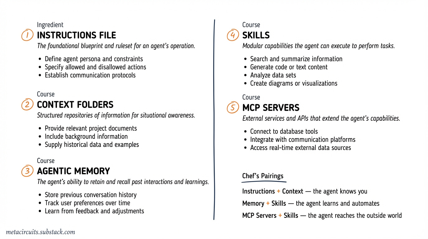The beauty is that each ingredient compounds the others. An instruction file with good context files is already powerful. Add memory and it gets smarter over time. Add skills and you stop repeating yourself. Add MCP servers and your agent is now able to reach beyond your machine.