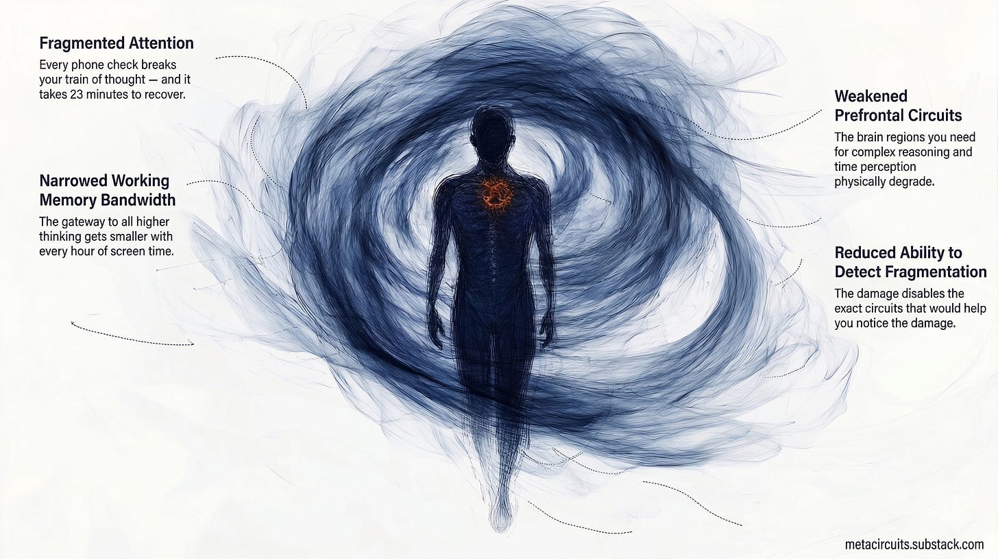 Each year of fragmented attention weakens the prefrontal circuits that would help you detect the fragmentation. Each year of cognitive offloading reduces the hippocampal capacity you’d need to stop offloading.