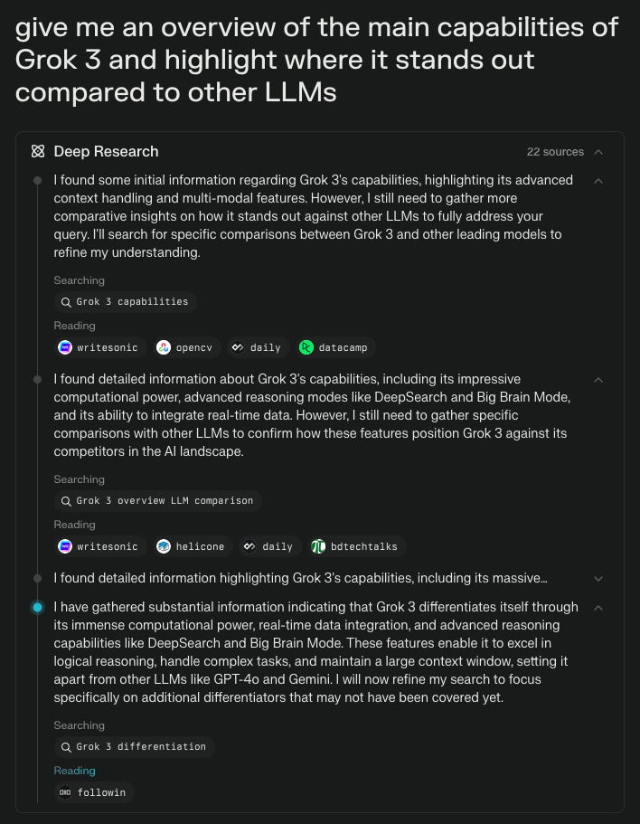 Take Perplexity AI, my daily driver. Last week they released “Deep Research” capabilities as part of their Pro subscription. Deep research leverages the reasoning capabilities of LLMs (Large Language Models) to iteratively refine and research answers to user questions.
